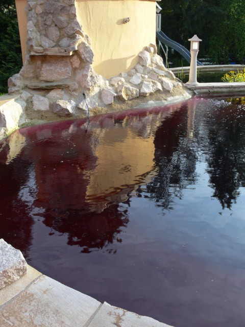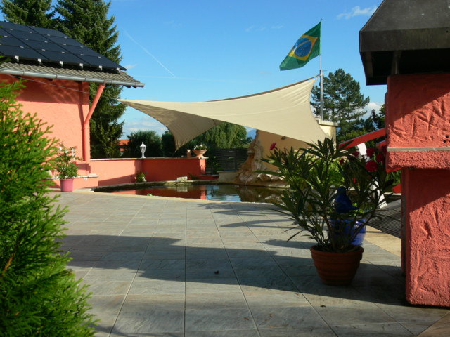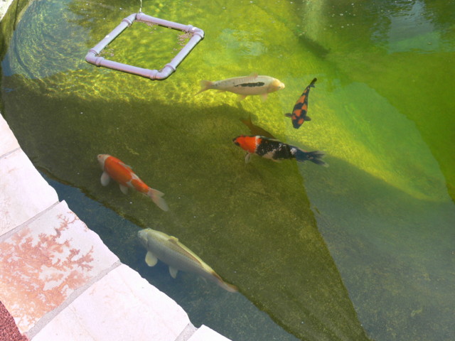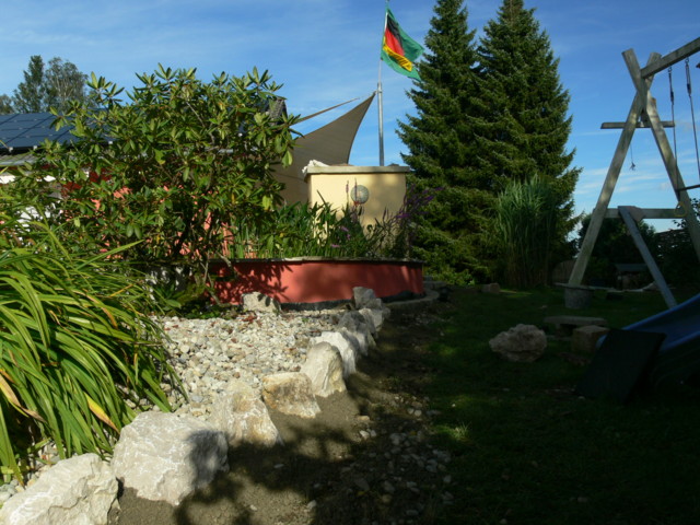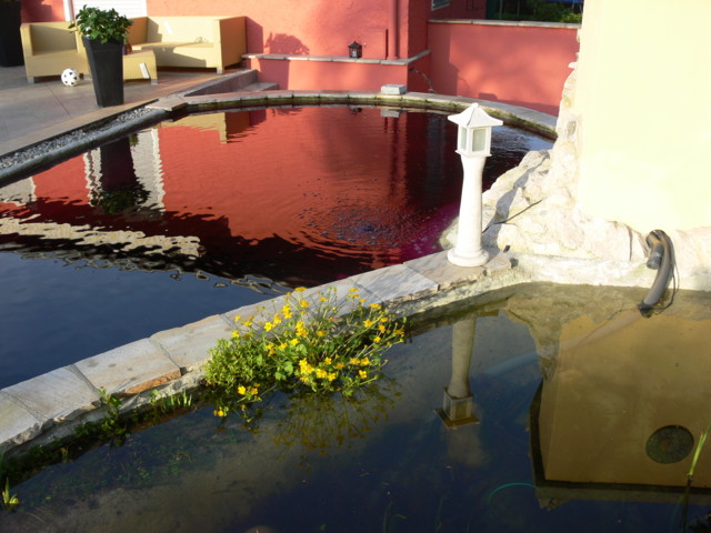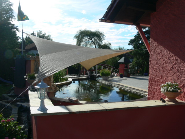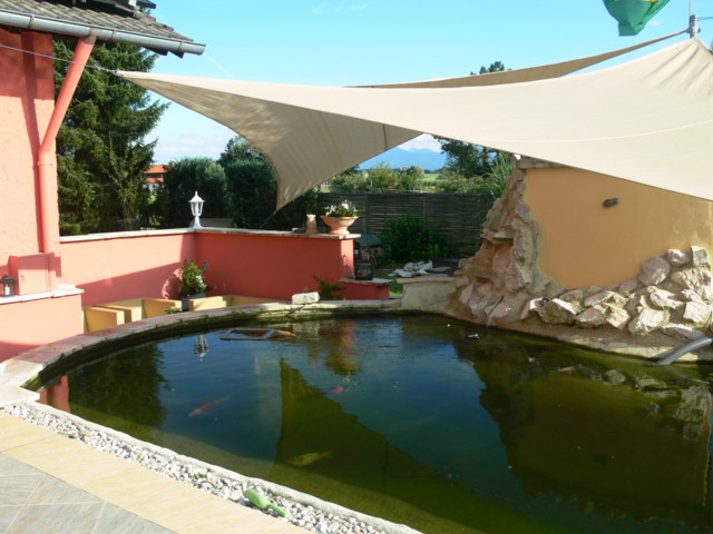 Seitdem wir die beiden Dreiecks-Sonnensegel zur Abschattung installiert haben, halten sich die hohen Wassertemperaturen einigermaßen in Grenzen.....- aber wir hatten HEUER in 2010 nicht eine einzige Fadenalge.......- der inzwischen sehr dicht wachsende Pflanzen-Filter tut mit Sicherheit sein übriges.....