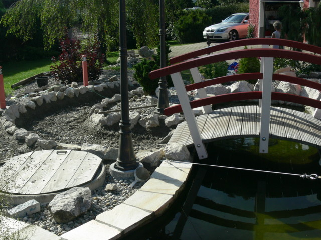 - Granit-Randstein-Einfassung und Befestigung sämtlicher Bruchstein-Begrenzungen zum Rasen, Weg und Teichmauer.
