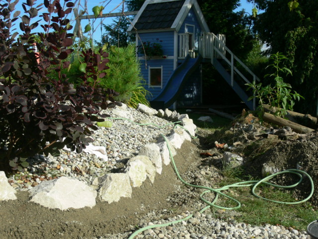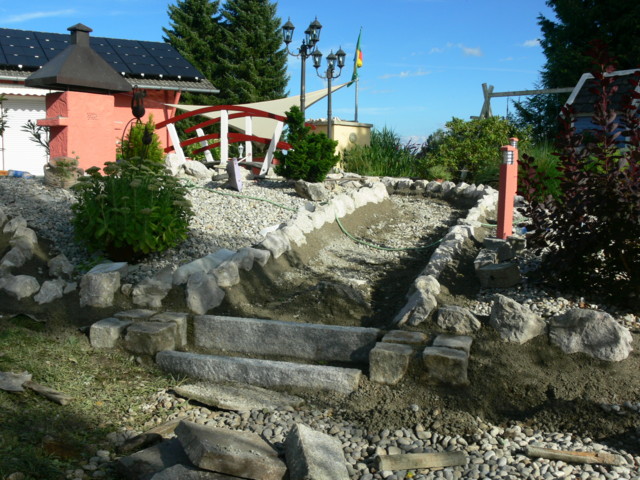 Hintere Abgrenzung mit Kalksteinen in Richtung des Pflanzenfilters....- ab hier wurde dann mit Granit-Pflastersteinen weitergearbeitet...