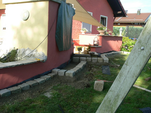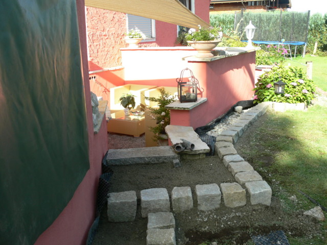 Vor dem Technik-Haus entsteht eine Standfläche + Trittfläche auf Treppen-Niveau, welches demnächst mit "Mosaik-Granitsteinen" ausgegossen wird (wie schon meine Trittstufen hinunter zu unserem Sitzplatz.).